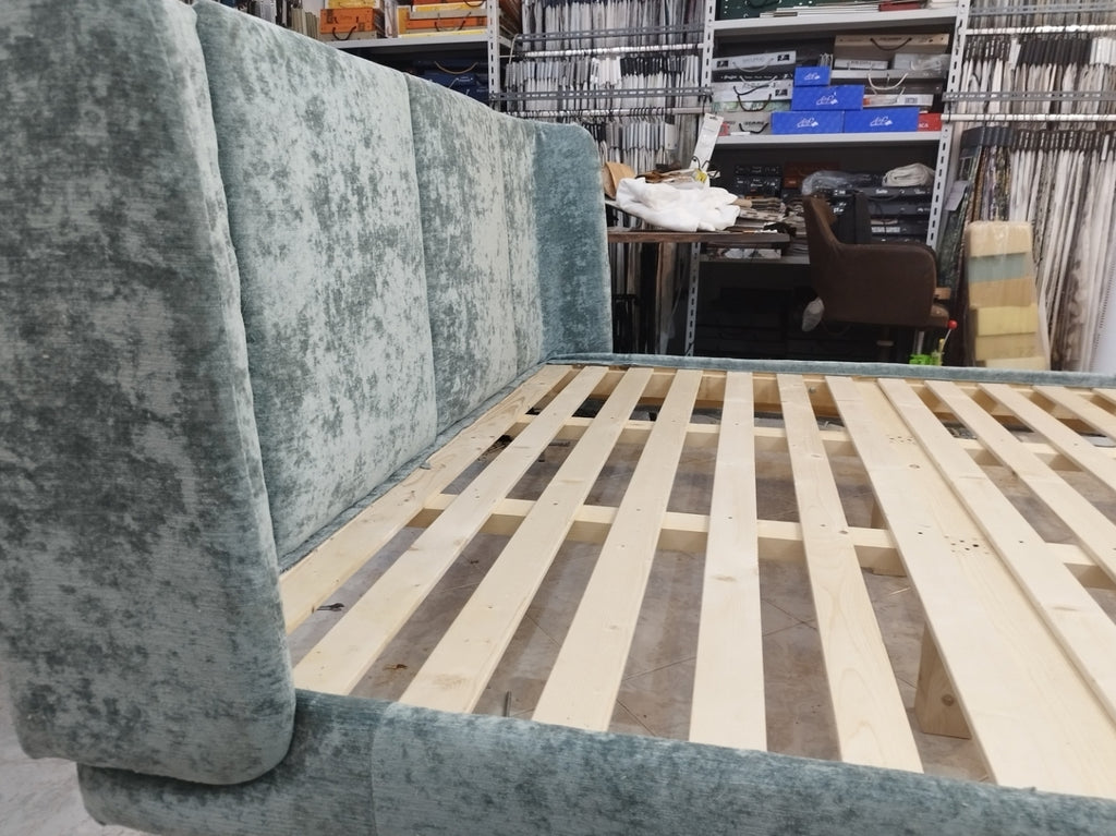 Struttura per letto completamente realizzata a mano in abete e faggio, imbottiture morbide e delicate.